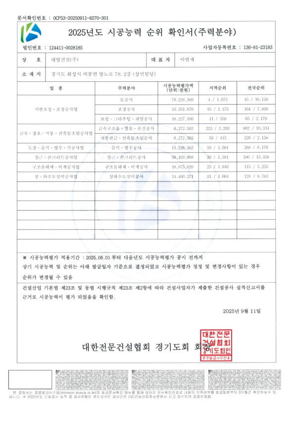 2025년도 시공능력 순위 확인서가 위와 같이 확정되었습니다.